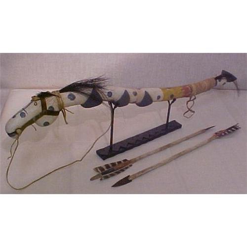 REAT OLD CEREMONIAL HORSE DANCE STICK WITH TWO ARROWS. HARD TO FIND! FROM FORT BERTHOLD RESERVATION. 30" LONG STICK. ARROWS ARE 18 3/4" LONG. EXCELLENT.GUARANTEED OLD AND ORIGINAL.