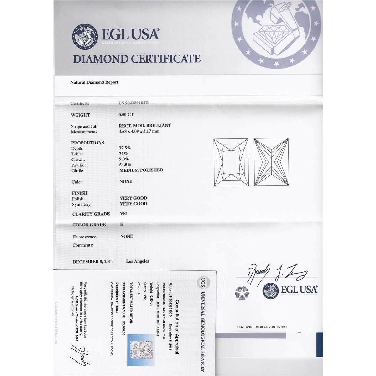 CERT. 0.50 CTW RECT. MOD. BRILLIANT DIAMOND H/VS1 **|**|** 4.68X4.09X3.17mm;Cut Very Good; Polish VERY GOOD; Symmetry VERY GOOD; Fluo NONE; Depth 77.5%; Table76% ; MSRP: $9000
