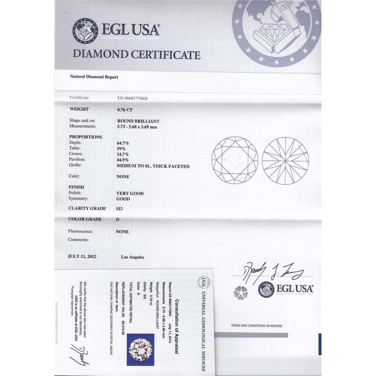 CERT. 0.76 CTW ROUND BRILLIANT DIAMOND D/SI2 **|**|** 5.73X5.68X3.69mm;Cut Very Good; Polish VERY GOOD; Symmetry GOOD; Fluo NONE; Depth 64.7%; Table 59% ; MSRP: $13200