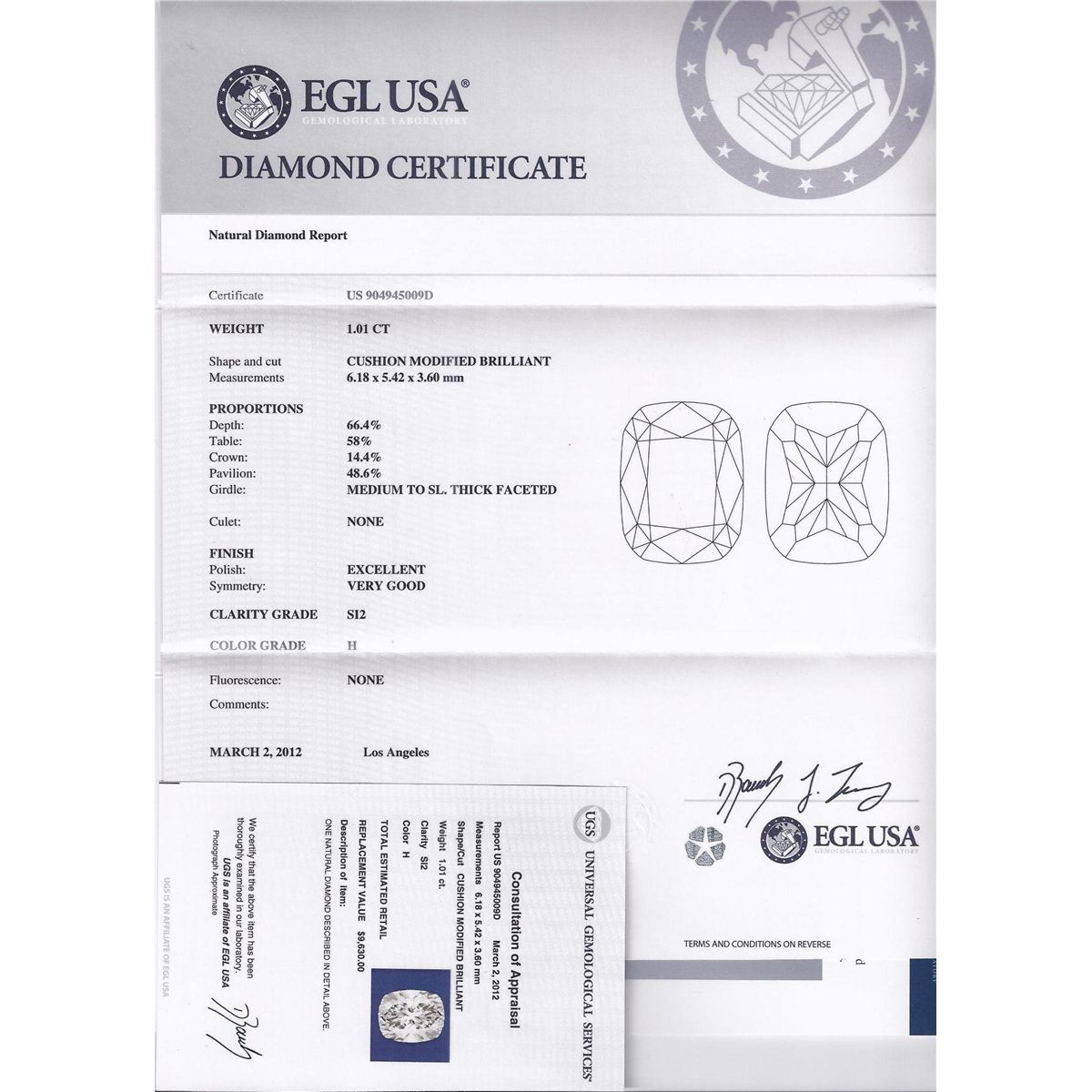 CERT. 1.01 CTW CUSHION MODIFIED BRILLIANT DIAMOND H/SI **|**|** 6.18X5.42X3.60mm;Cut Very Good; Polish EXCELLENT; Symmetry VERY GOOD; Fluo NONE; Depth 66.4%; Table58% ; MSRP: $15000