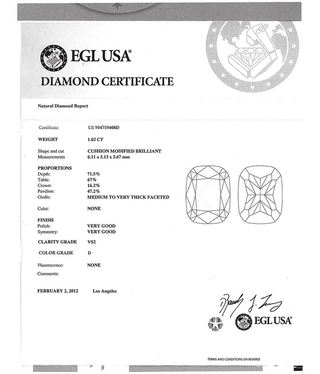 CERT. 1.02 CTW CUSHION MOD. BRILLIANT DIAMOND D/VS2 **|**|** 6.11X5.13X3.67mm;Cut Very Good; Polish VERY GOOD; Symmetry VERY GOOD; Fluo NONE; Depth 71.5%; Table67% ; MSRP: $24000
