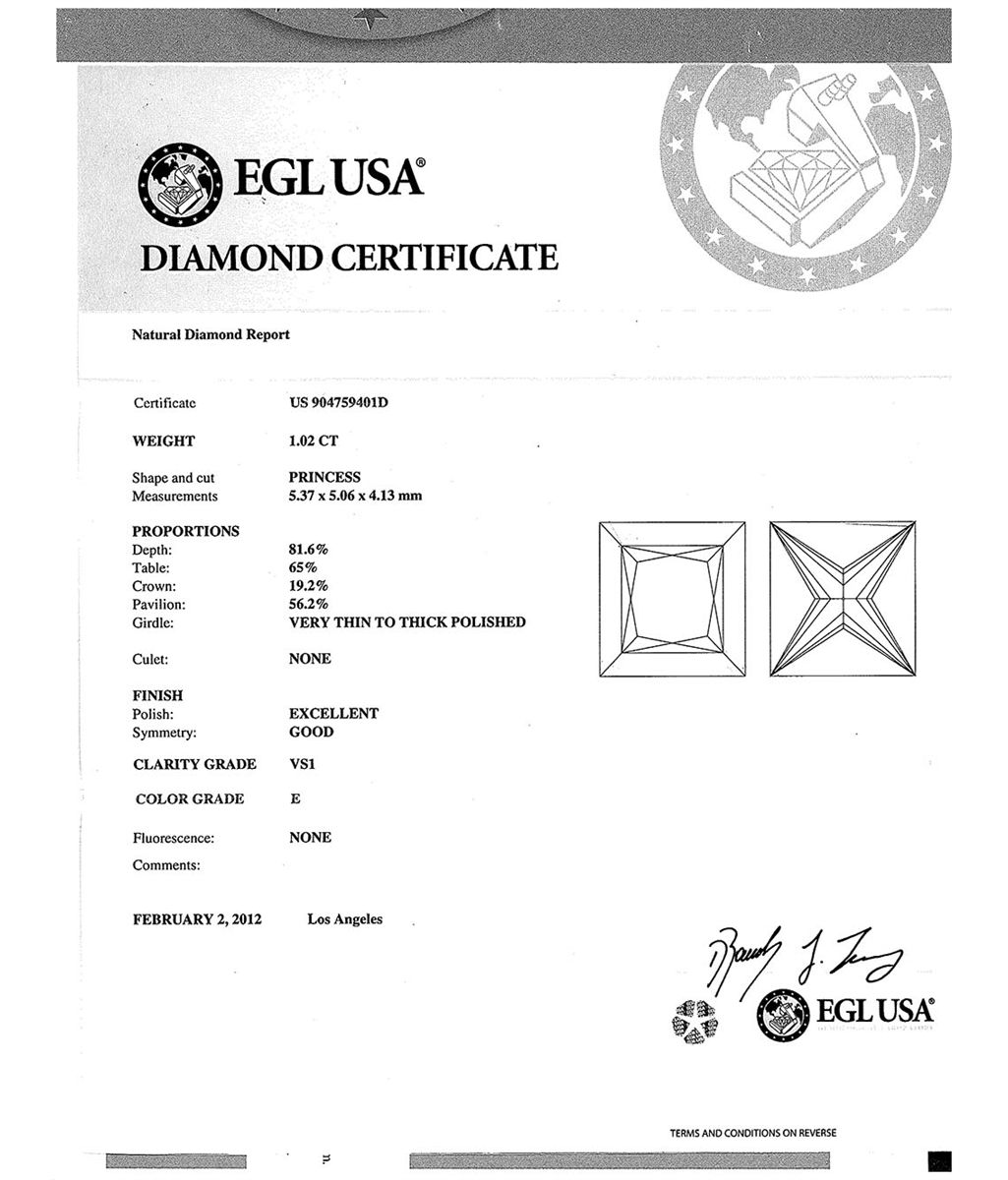 CERT. 1.02 CTW PRINCESS CUT DIAMOND E/VS1 **|**|** 5.37X5.06X4.13mm;Cut Very Good; Polish EXCELLENT; Symmetry GOOD; Fluo NONE; Depth 81.6%; Table 65% ; MSRP: $25200