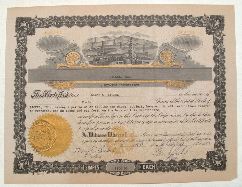Incorporated in Wyoming. Cert. #1, issued in 1973 for 40 shares to Glenn G. Bickel. Signed by Glenn G. Bickel as president and Mary E. Bickel as secretary. It is a regular Bickel family reunion! Vignette of an oil field with many derricks at the top. Black and gold on crème with gold seal. 11” x 8”. U/C. Goes. Small piece missing from bottom right corner. Fine.