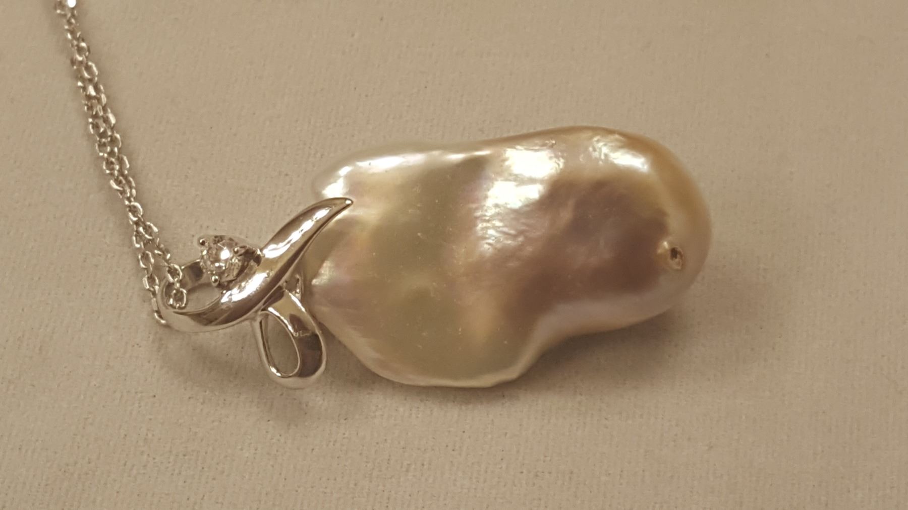 NATURAL CERTIFIED 8.44 GRAMS MALUKU ISLAND PEARL PENDANT FROM THE MALUKU ISLANDS IN INDONESIA NON TREATED SOUTH SEA BEAUTY.HIGH LUSTER & THICK NACRE .HAS A WHITE TOPAZ ACCENT STONE.MEASURES 36.96 x 16.98 x 10.82 mm. INCLUDES 20 " 2MM SOLID STERLING SILVER CHAIN