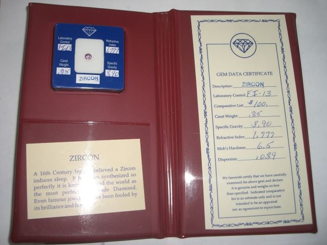 CERTIFIED .85 CARAT ZIRCON ROUND CUT!! COMES IN CERT CASE WITH PAPERWORK AND APPRAISAL SHOWS $100.00 BUT IS AN OLD LIST PRICE!! GEM CAME OUT OF SAFE!! ***Coin, Currency & All Items Listed in this auction - Grades, Conditions and Values are not Safe Deposit Coins LLC Responsibilty. Grades, Condition and Values are determined by Consigner(s) & Buyers ONLY***