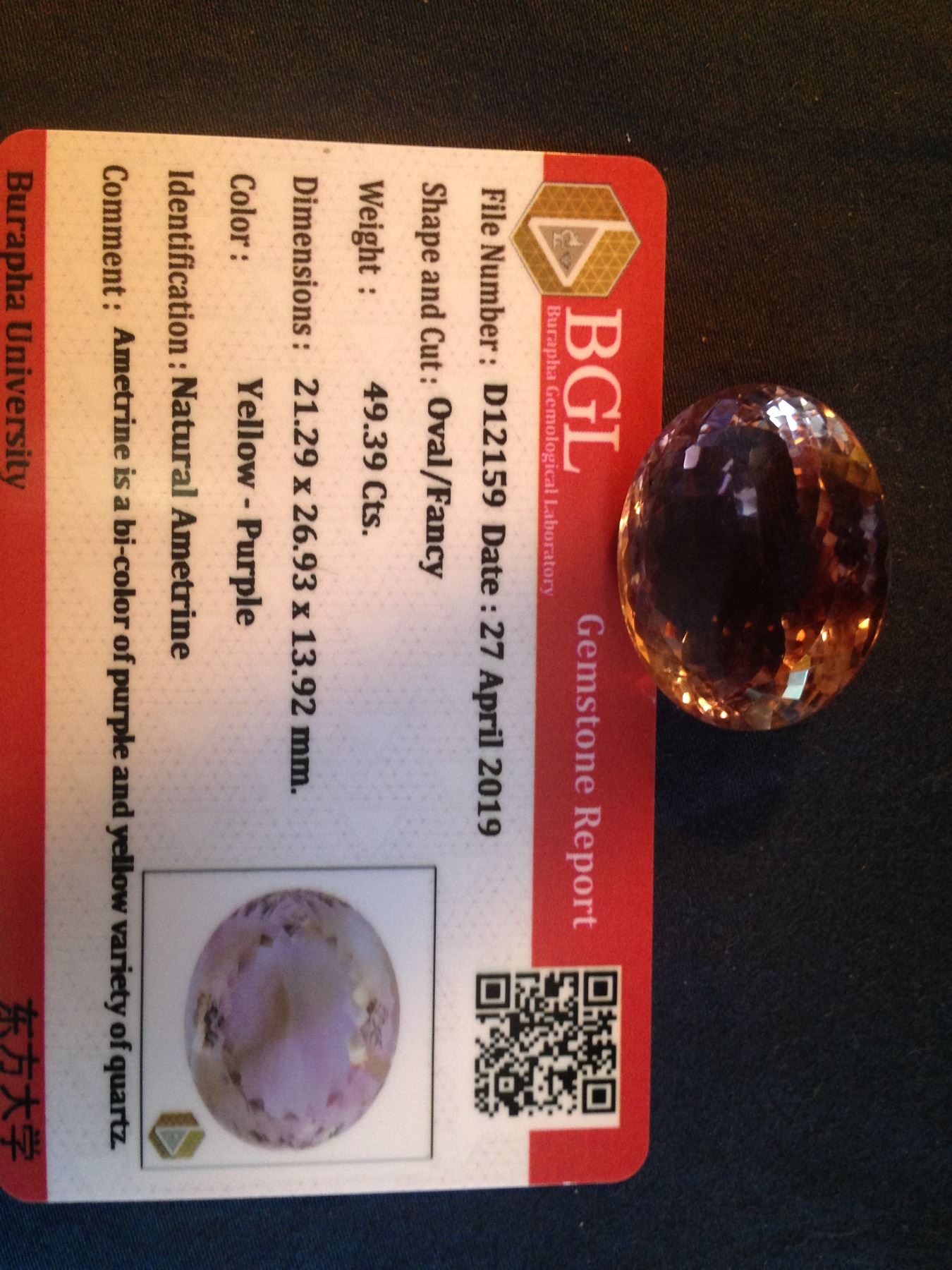 CERTIFIED UNHEATED 49.39 CT BI-COLOR BOLIVIAN AMETRINE.RARE TO FIND THIS LARGE OF SIZE IN VVS1 CONDITION. NEAR FLAWLESS . ALL NATURAL NO TREATMENT. FINE OVAL CUT MEASURING 21.29 x 26.93 x 13.92 mm.WOULD BE PERFECT FOR A FINE PENDANT. PLEASESEE CERTIFICATION FOR FURTHER DETAILS.