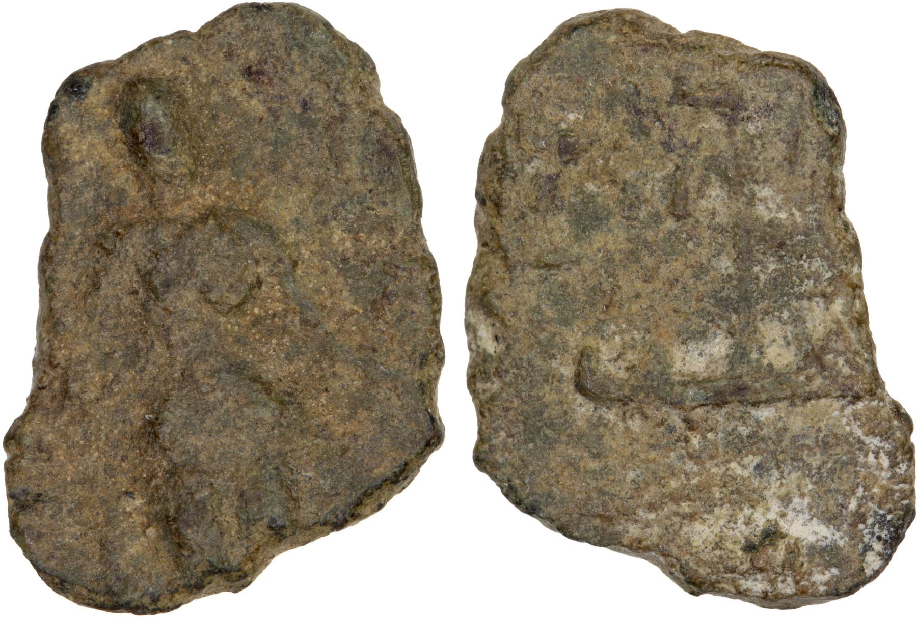 CEYLON: Anonymous, ca. 1st-3rd century AD, AE tiny rectangular plaque (0.46g), Mitch-5052/53, standing deity // railed swastika, F-VF, RR, ex James Ambrose Higham Collection.
