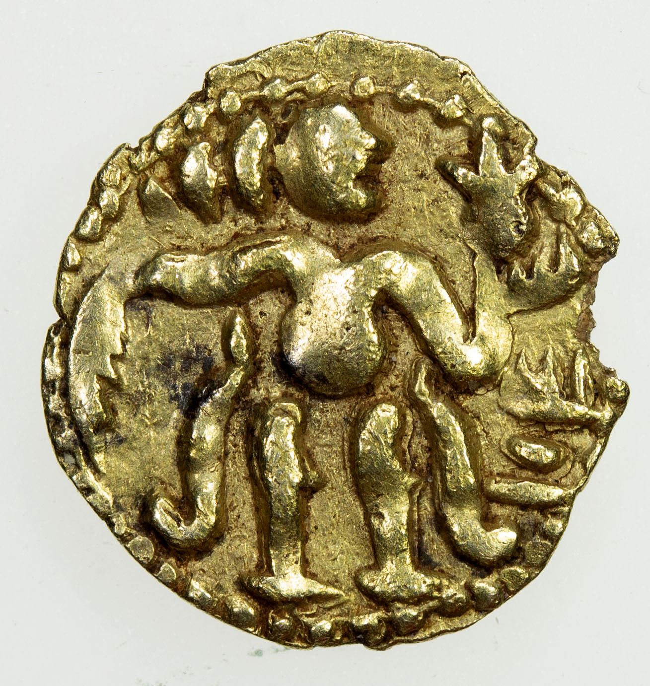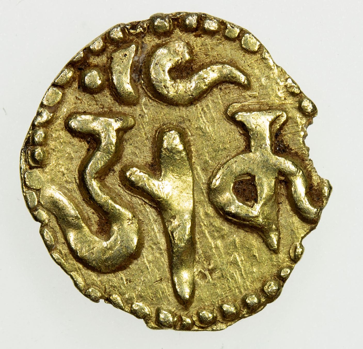 CEYLON (MEDIEVAL): Anonymous, 10th-11th century, AV aka (1/8 kahavanu) (0.48g), Mitch-828/30, Vishnu standing right // conch shell over inscription, bold EF.