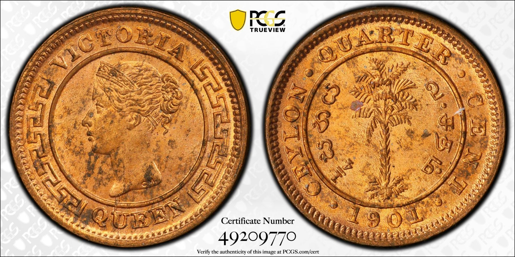 CEYLON: Victoria, 1837-1901, AE 1/4 cent, 1901, PCGS graded MS64 RD