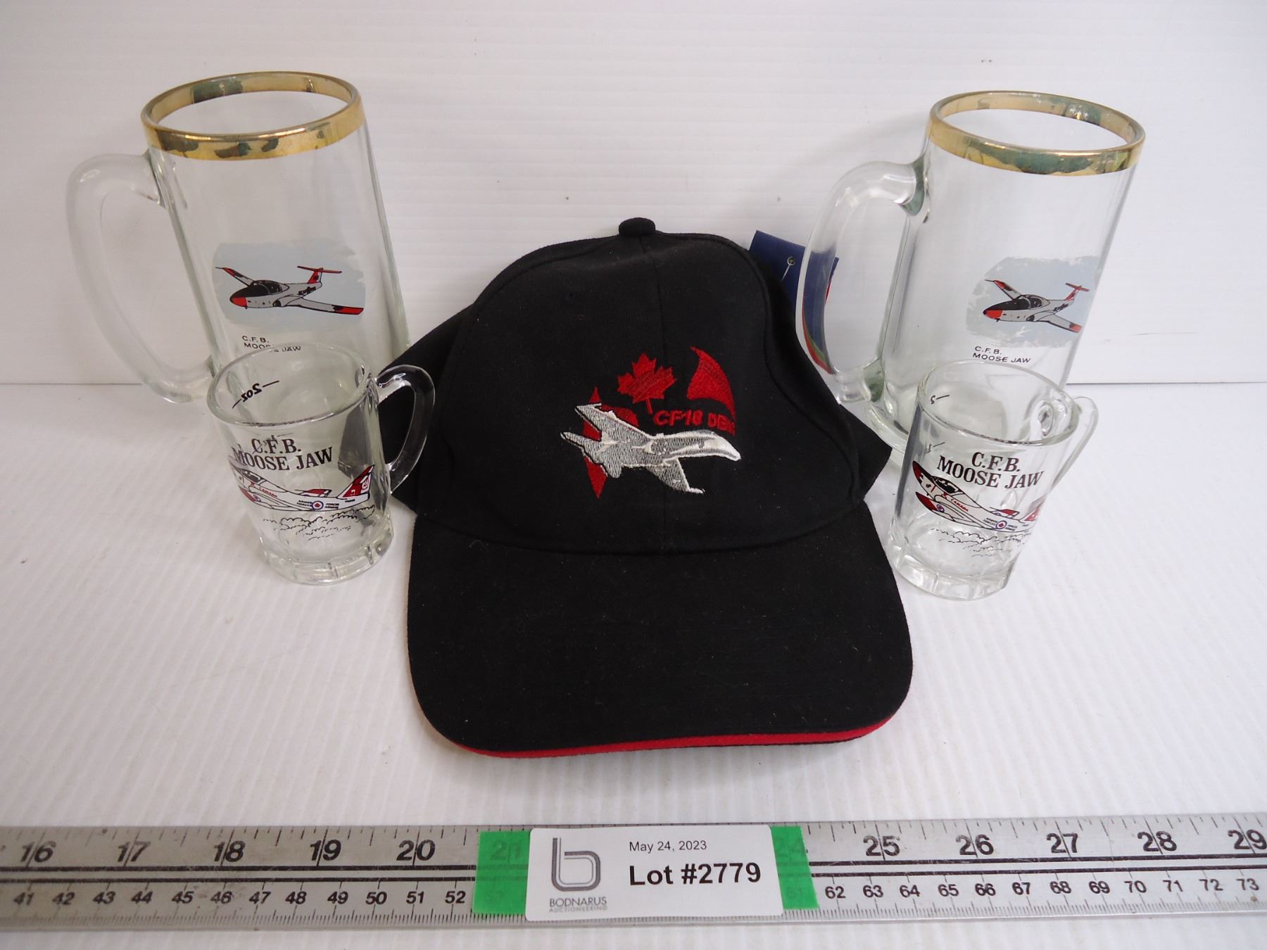 CF-18 Demo Ballcap with (2) Vintage Gold Rimmed Snowbird Glass Mugs and (2) Glass Mini Mugs