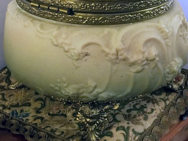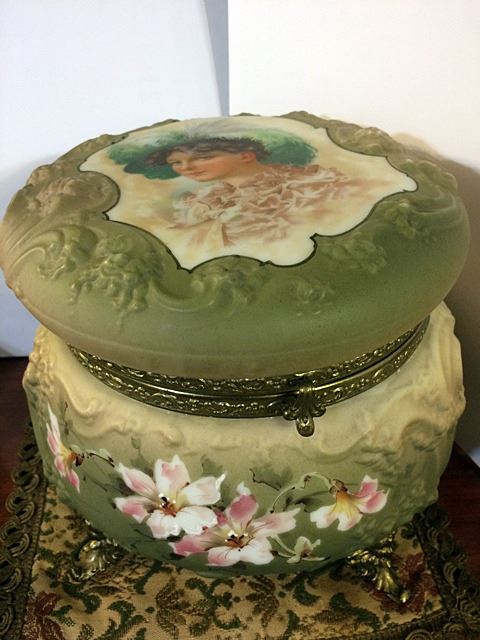 Stunning CF Monroe Wave Crest Nakara Victorian ladies dresser box. Made by the CF Monroe Company of Meriden CT in the late 1800s, this beautiful dresser box features a full cameo of fine Victorian lady, flowers, rococo glass in green, brass rings and clasp, and 4 brass feet featuring Cherub faces. Marked CFM Co Nakara on bottom of piece. The CF Monroe Company of Meriden was famous for it's Wave Crest glasswork of the finest quality. This dresser box is absolutely stunning, and is a wonderful representation of CF Monroe glass. Measures approx. 7" tall x 7" wide, looks to be small seperation in glass from ring at top of base, but may have very well made this way, as it does not look to have been broken or loose. These pieces are very rare, and the Nakara line is even rarer! You won't see one as nice as this one very often! The craftsmenship is exquisite, the detail of the cameo is exceptional!