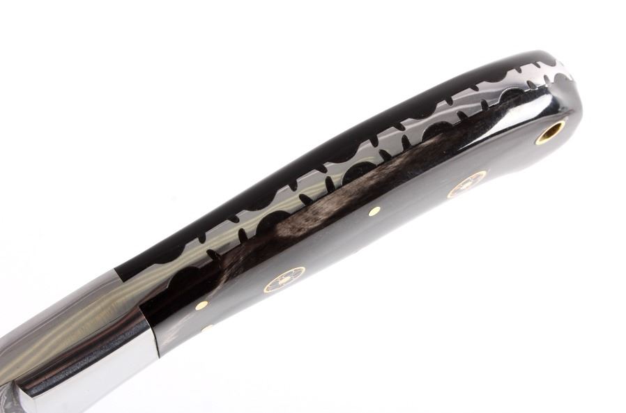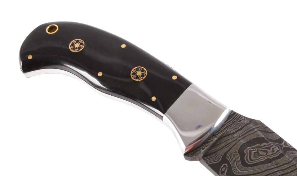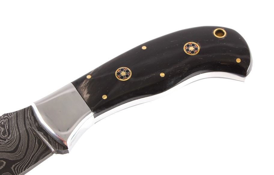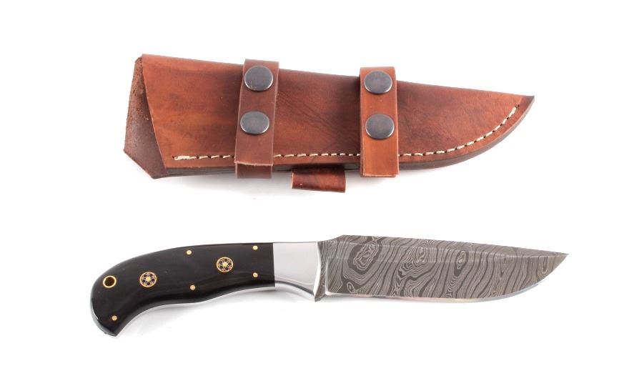 This is a hand crafted custom knife from CFK Cutlery Company. The knife has a hand forged folded 512 Layer Twist (1095HC/15N20) Damascus Steel Blade with a Great American Bison Buffalo horn handle. The knife or skinner has extravagant Vine File Work on the handle and blade spine all done by hand. The knife and sheath are both all hand custom made in the USA. Rare unmarked blade in a unique one of a kind style. Genuine Leather Sheath. Knife measures 9.5" with a 4.75" blade. Knife is in excellent, unused condition.