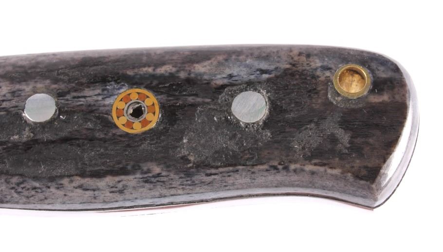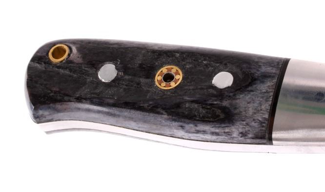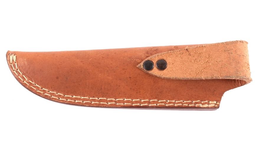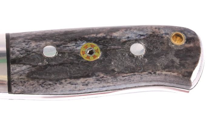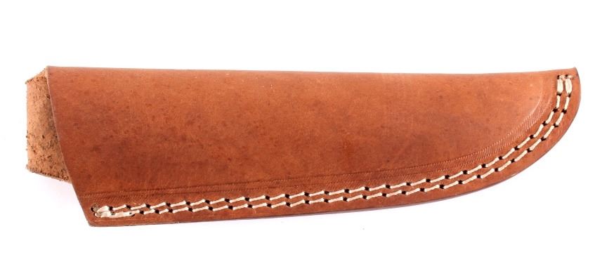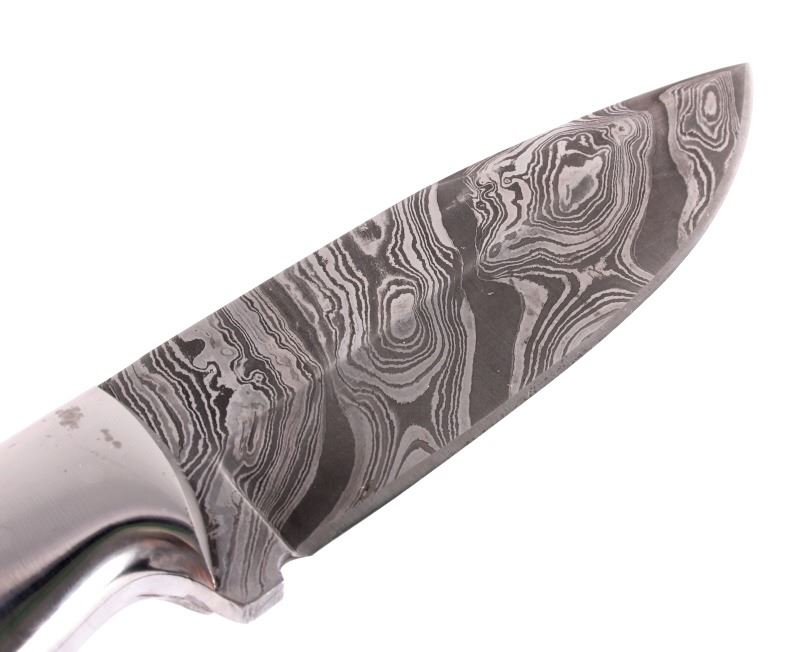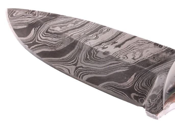 This is a hand crafted custom knife from CFK Cutlery Company. The knife has an excellent hand forged folded 512 Layer Twist (1095HC/15N20) polished Damascus Steel blade with a fitted beautiful exotic Camel bone handle set. The knife and sheath are both all hand custom made in the USA. Rare unmarked blade in a unique one of a kind style. Genuine Leather Sheath. The knife is in excellent brand new condition. The knife measures 9.25" with a 4.25" blade.