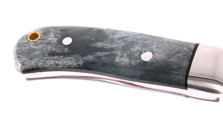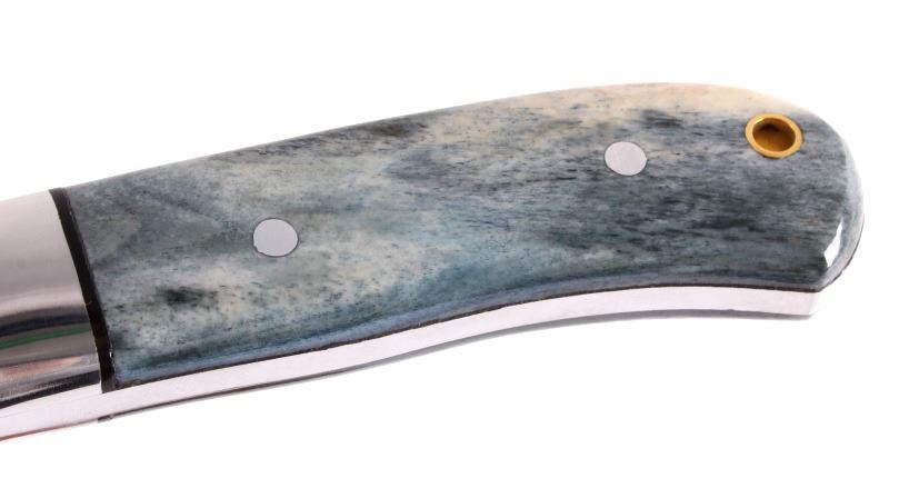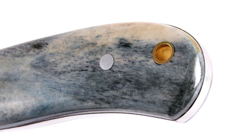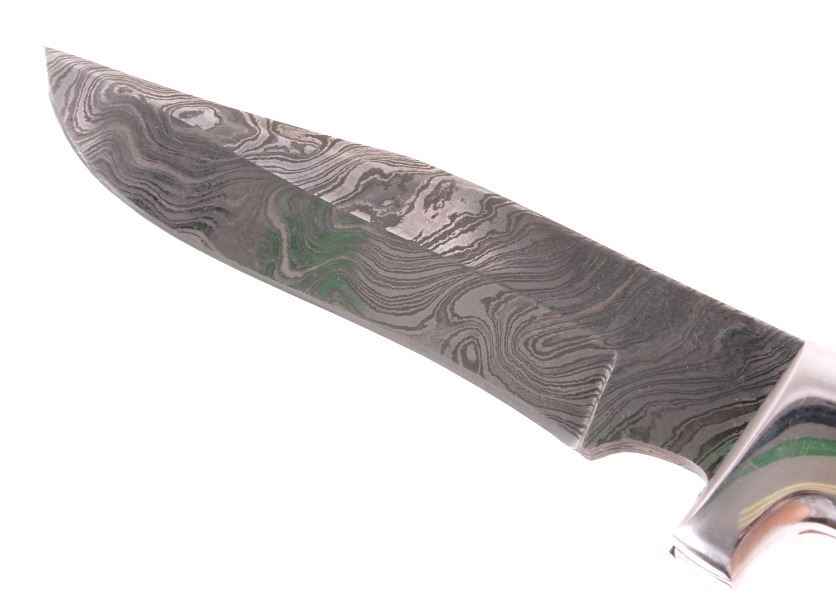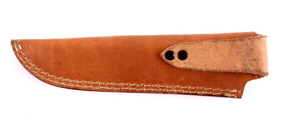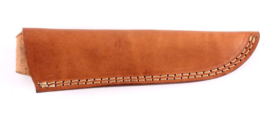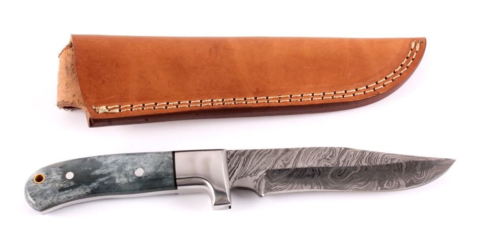This is a hand crafted custom knife from CFK Cutlery Company. The knife has an excellent hand forged folded 512 Layer Twist (1095HC/15N20) polished Damascus Steel blade with a fitted beautiful exotic Camel bone handle set. The knife and sheath are both all hand custom made in the USA. Rare unmarked blade in a unique one of a kind style. Genuine Leather Sheath. The knife is in excellent brand new condition. The knife measures10.25" with a 4.75" blade.