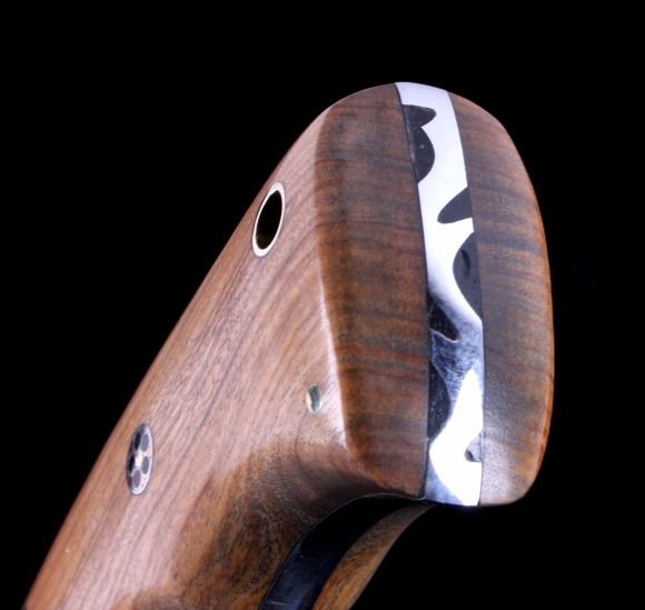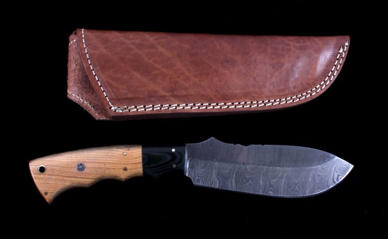 The lot features a hand forged and folded authentic Damascus steel blade. This is a CFK Cutlery Company custom hand made in the USA knife. The knife has an olive wood handle. The knife is a one of a kind uniquely created piece in very good condition. The piece also has very rare Vine File Work around the spine of the handle and blade all done by hand. The blade shows a hand forged folded 512 Layer Twist (1095HC/15N20) Damascus Steel. The knife is in good, unused condition. The knife measures 10" with a 5" blade.