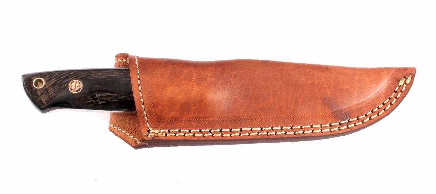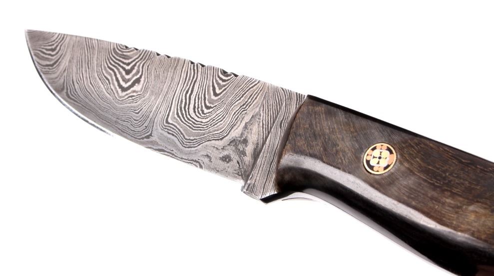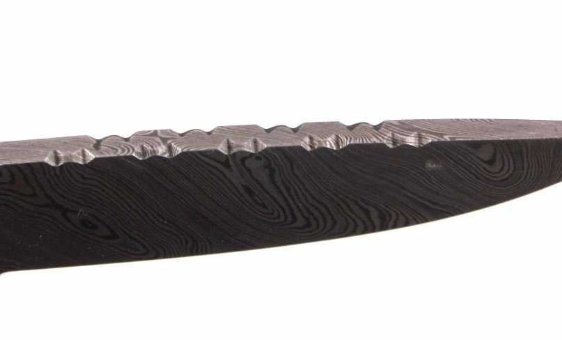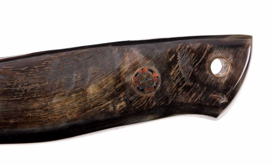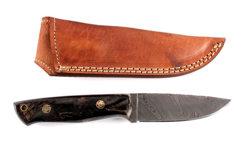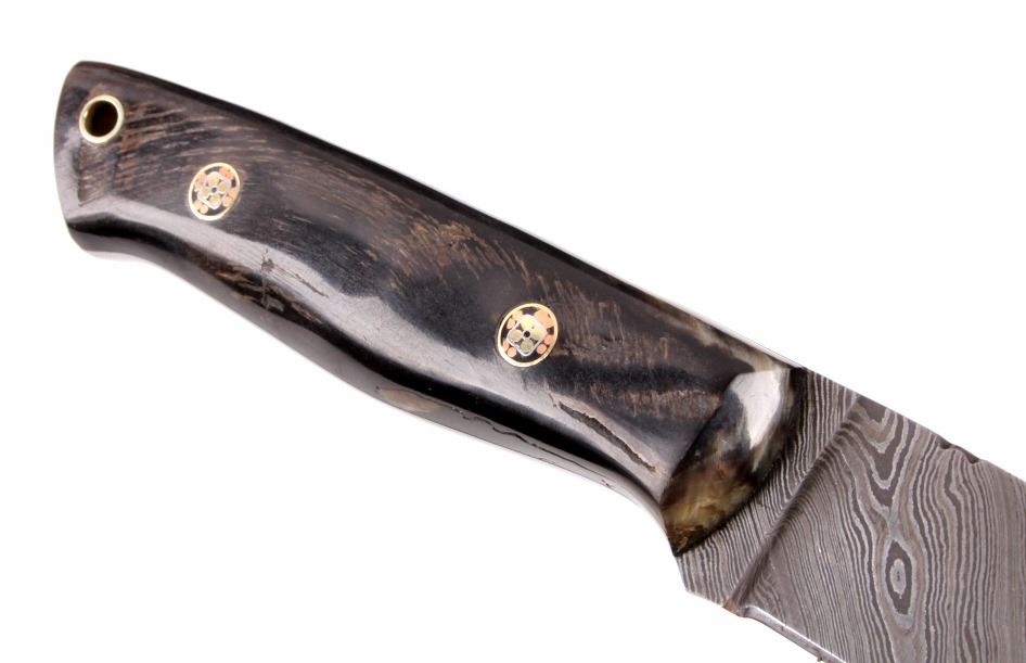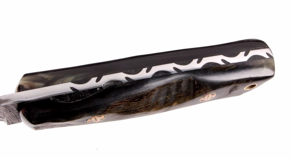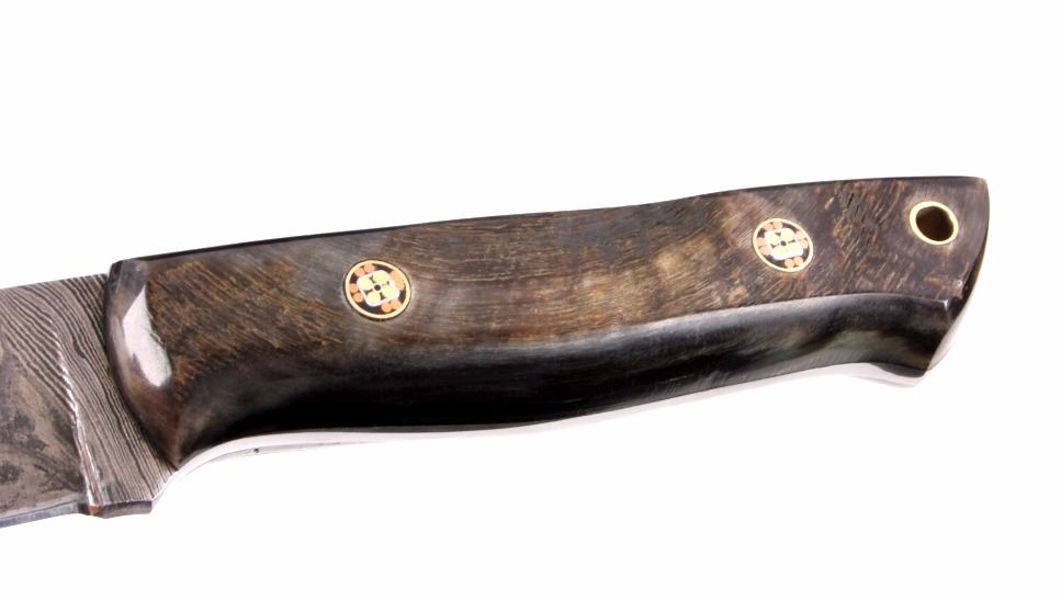 This is a CFK Cutlery Company custom hand made in the USA knife. The knife features a hand forged and folded authentic Damascus steel blade. It has a ram's horn handle with brass and stainless steel. The knife is a one of a kind uniquely created piece in very good condition. The piece also has very rare Vine File Work around the spine of the handle and blade all done by hand. The blade shows a hand forged folded 512 Layer Twist (1095HC/15N20) Damascus Steel. The knife is in good, unused condition. The knife measures 8.5" with a 3.75" blade.