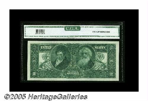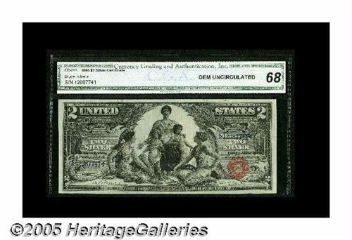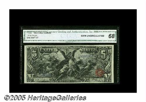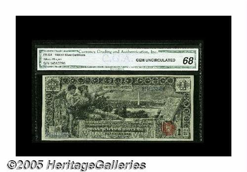 <B>CGA Gem Uncirculated 68 Educational Set.</B></I> Includes Fr. 224, Fr. 248, Fr. 268. The only set of Educationals graded 68 by CGA. There are two other Ones and one other Deuce, but this is the only Five, making this the only CGA-68 set that can be assembled to this date. All three notes are hugely margined, magnificent pieces with dead-perfect color and ideal centering of both sides. Educational Sets have always been extremely popular, and it seems unlikely to this cataloger that any set could have a finer appearance than these three stately notes. The prices for high graded third-party notes have spiked recently, and estimating this incomparable set is a task that we do not wish to undertake. Suffice it to say that the competition will at the very least be brisk, and a record price for an Educational Set is a distinct possibility.