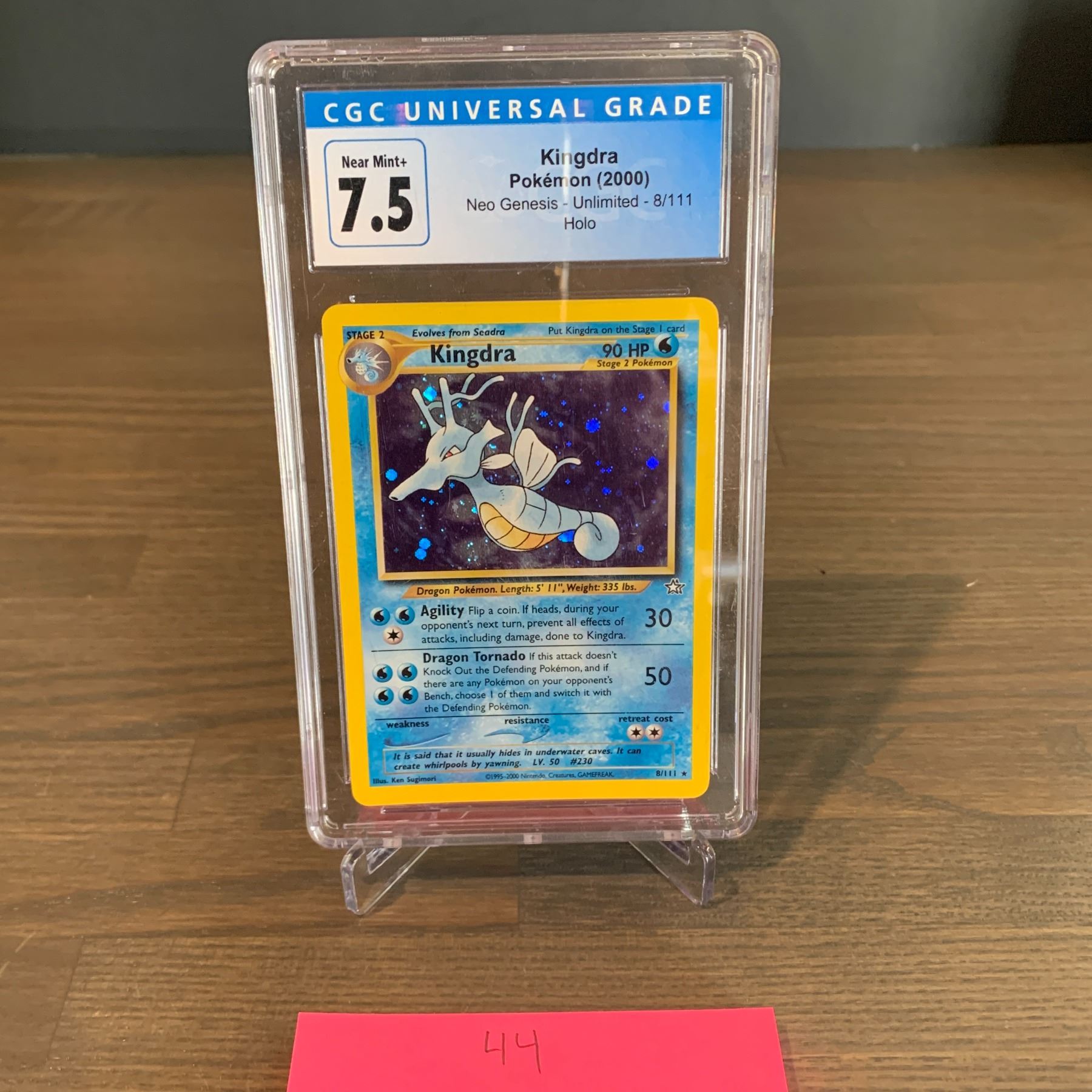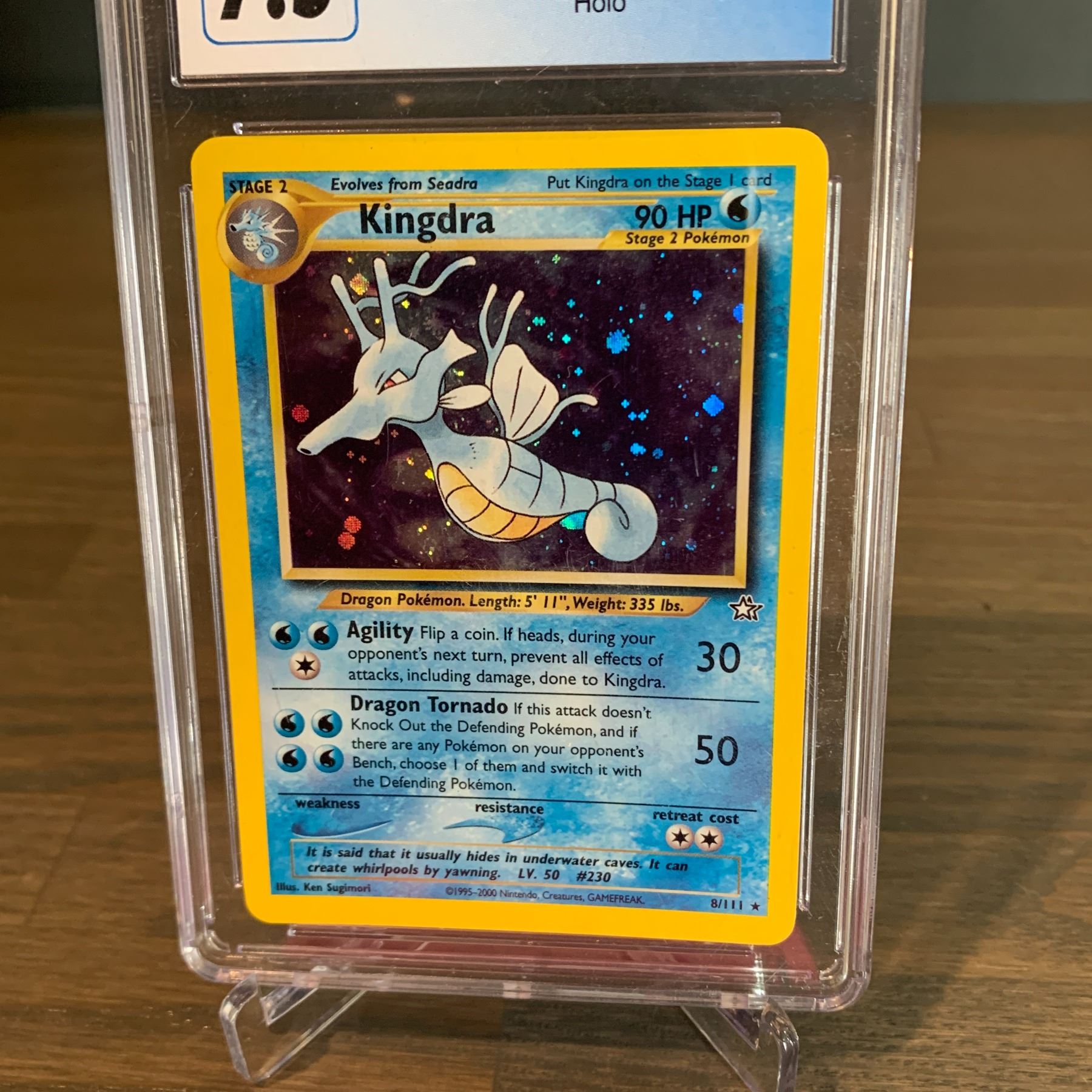 CGC 7.5 NEAR MINT+ Kingdra #8 Holo Vintage Neo Genesis Pokemon card. See photos for condition. If you are interested in consigning with us, email aeronhouse1994@gmail.com or fill out the consignment form on ahauctionhouse.com