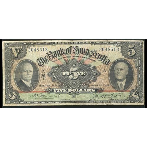 CH-550-34-02, 1929 $5 The Bank of Nova Scotia. A nice example in F to VF. #30448513