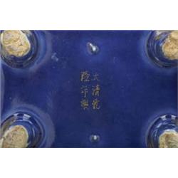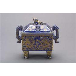 Finely detailed, Chinese 18th Century, Ch'ien Lung mark and probably of the period, cobalt-blue glazed and gilt, archaistic-form porcelain censer (fang ding); dragons, flaming pearl and archaistic characters on the body, animal mask feet, dragon-form handles and lion finial (glaze chip and wear to rim); W: 7"
