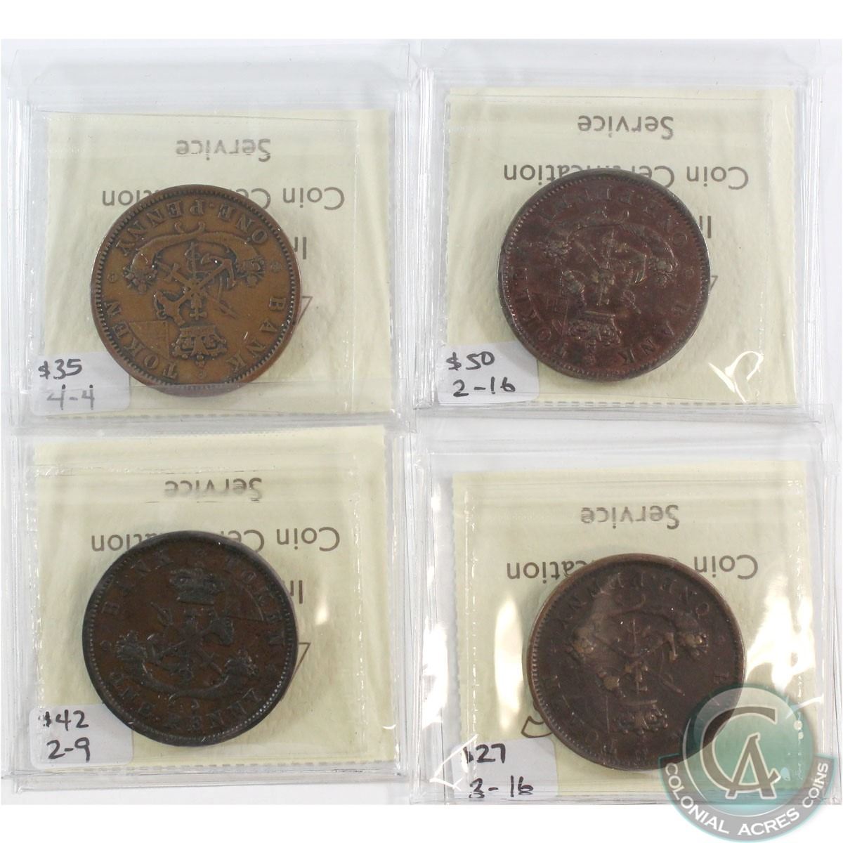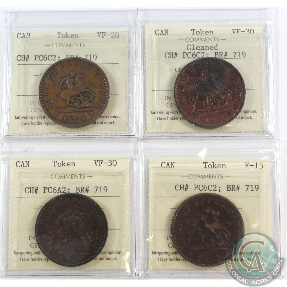 CH# PC6C2 x4, 1854 Bank of Upper Canada One Penny all Tokens ICCS Certified. Lot includes 1x F-15, VF-20, VF-30, & VF-30 Cleaned. 4pcs.