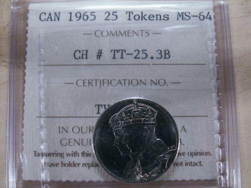 CH-TT-25.3B 1965 25¢ Test Token round Cupro-Nickel Conjoined busts of King George VI and Queen Elizabeth/Three Canada Geese. ICCS MS64 Rare and seldom offered.