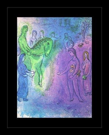 CHAGALL 1977 "DAPHNIS AND CHLOE" LITHOGRAPH - "THE ARRIVAL OF DIONYSOPHANES" BY MARC CHAGALL FROM THE "DAPHNIS AND CHLOE" COLLECTION - PUBLISHED IN 1977 BY GEORGE BRAZILLER (BOOK PLATE) - APPROX. IMAGE SIZE: 9.5 X 12.75 IN AND PROFESSIONALLY FRAMED GALLERY STYLE WITH BLACK ACID FREE MATT AND BLACK SOLID WOOD FRAME