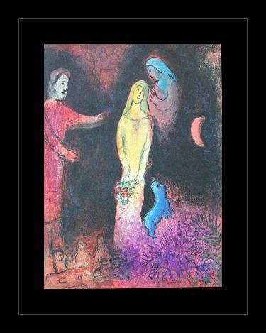 CHAGALL 1977 "DAPHNIS AND CHLOE" LITHOGRAPH - "CHLOE DRESSED AND COIFFURED BY CLEARISTA" BY MARC CHAGALL FROM THE "DAPHNIS AND CHLOE" COLLECTION - PUBLISHED IN 1977 BY GEORGE BRAZILLER (BOOK PLATE) - APPROX. IMAGE SIZE: 9.5 X 12.75 IN AND PROFESSIONALLY FRAMED GALLERY STYLE WITH BLACK ACID FREE MATT AND BLACK SOLID WOOD FRAME