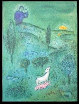 CHAGALL 1977 "DAPHNIS AND CHLOE" LITHOGRAPH - "DAPHNIS IS FOUND BY LAMON" BY MARC CHAGALL FROM THE "DAPHNIS AND CHLOE" COLLECTION - PUBLISHED IN 1977 BY GEORGE BRAZILLER (BOOK PLATE) - APPROX. IMAGE SIZE: 9.5 X 12.75 - UNFRAMED