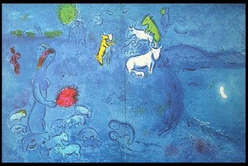 CHAGALL 1977 "DAPHNIS AND CHLOE" LITHOGRAPH - "SPRING" BY MARC CHAGALL FROM THE "DAPHNIS AND CHLOE" COLLECTION - PUBLISHED IN 1977 BY GEORGE BRAZILLER (BOOK PLATE) - APPROX. IMAGE SIZE: 18.5 X 12.75 - UNFRAMED