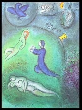 CHAGALL 1977 "DAPHNIS AND CHLOE" LITHOGRAPH - "DAPHNIS AND LYCOENIUM" BY MARC CHAGALL FROM THE "DAPHNIS AND CHLOE" COLLECTION - PUBLISHED IN 1977 BY GEORGE BRAZILLER (BOOK PLATE) - APPROX. IMAGE SIZE: 9.5 X 12.75 - UNFRAMED