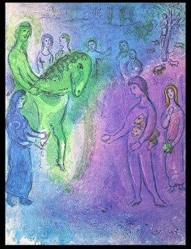 CHAGALL 1977 "DAPHNIS AND CHLOE" LITHOGRAPH - "THE ARRIVAL OF DIONYSOPHANES" BY MARC CHAGALL FROM THE "DAPHNIS AND CHLOE" COLLECTION - PUBLISHED IN 1977 BY GEORGE BRAZILLER (BOOK PLATE) - APPROX. IMAGE SIZE: 9.5 X 12.75 - UNFRAMED