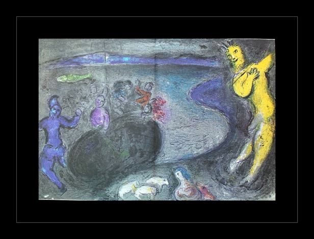 CHAGALL 1977 "DAPHNIS AND CHLOE" LITHOGRAPH - "THE DREAM OF BRYAXIS, LEADER OF THE METHYMNAENS" BY MARC CHAGALL FROM THE "DAPHNIS AND CHLOE" COLLECTION - PUBLISHED IN 1977 BY GEORGE BRAZILLER (BOOK PLATE) - APPROX. IMAGE SIZE: 18.5 X 12.75 IN AND PROFESSIONALLY FRAMED GALLERY STYLE WITH BLACK ACID FREE MATT AND BLACK SOLID WOOD FRAME