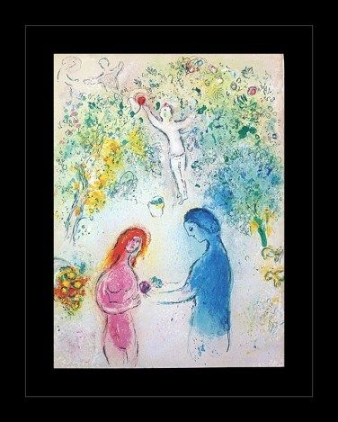 CHAGALL 1977 "DAPHNIS AND CHLOE" LITHOGRAPH - "DAPHNIS AND CHLOE" BY MARC CHAGALL FROM THE "DAPHNIS AND CHLOE" COLLECTION - PUBLISHED IN 1977 BY GEORGE BRAZILLER (BOOK PLATE) - APPROX. IMAGE SIZE: 9.5 X 12.75 IN AND PROFESSIONALLY FRAMED GALLERY STYLE WITH BLACK ACID FREE MATT AND BLACK SOLID WOOD FRAME