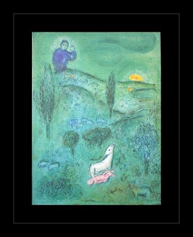 CHAGALL 1977 "DAPHNIS AND CHLOE" LITHOGRAPH - "DAPHNIS IS FOUND BY LAMON" BY MARC CHAGALL FROM THE "DAPHNIS AND CHLOE" COLLECTION - PUBLISHED IN 1977 BY GEORGE BRAZILLER (BOOK PLATE) - APPROX. IMAGE SIZE: 9.5 X 12.75 IN AND PROFESSIONALLY FRAMED GALLERY STYLE WITH BLACK ACID FREE MATT AND BLACK SOLID WOOD FRAME