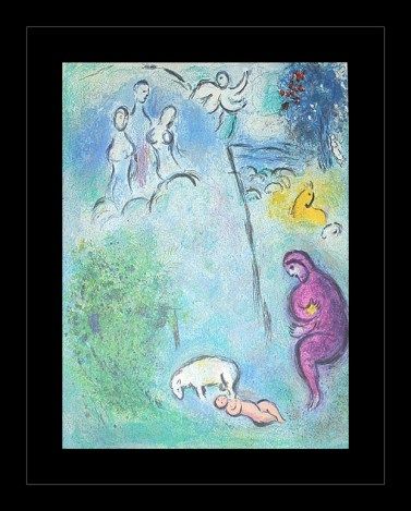 CHAGALL 1977 "DAPHNIS AND CHLOE" LITHOGRAPH - "CHLOE IS FOUND BY DRYAS" BY MARC CHAGALL FROM THE "DAPHNIS AND CHLOE" COLLECTION - PUBLISHED IN 1977 BY GEORGE BRAZILLER (BOOK PLATE) - APPROX. IMAGE SIZE: 9.5 X 12.75 IN AND PROFESSIONALLY FRAMED GALLERY STYLE WITH BLACK ACID FREE MATT AND BLACK SOLID WOOD FRAME