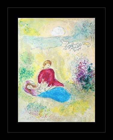 CHAGALL 1977 "DAPHNIS AND CHLOE" LITHOGRAPH - "THE SWALLOW" BY MARC CHAGALL FROM THE "DAPHNIS AND CHLOE" COLLECTION - PUBLISHED IN 1977 BY GEORGE BRAZILLER (BOOK PLATE) - APPROX. IMAGE SIZE: 9.5 X 12.75 IN AND PROFESSIONALLY FRAMED GALLERY STYLE WITH BLACK ACID FREE MATT AND BLACK SOLID WOOD FRAME