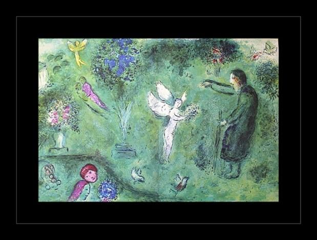 CHAGALL 1977 "DAPHNIS AND CHLOE" LITHOGRAPH - "PHILETAS AND HIS ORCHARD" BY MARC CHAGALL FROM THE "DAPHNIS AND CHLOE" COLLECTION - PUBLISHED IN 1977 BY GEORGE BRAZILLER (BOOK PLATE) - APPROX. IMAGE SIZE: 18.5 X 12.75 IN AND PROFESSIONALLY FRAMED GALLERY STYLE WITH BLACK ACID FREE MATT AND BLACK SOLID WOOD FRAME