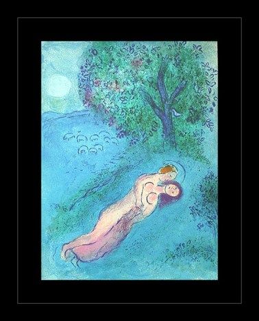 CHAGALL 1977 "DAPHNIS AND CHLOE" LITHOGRAPH - "THE LESSON OF PHILETAS" BY MARC CHAGALL FROM THE "DAPHNIS AND CHLOE" COLLECTION - PUBLISHED IN 1977 BY GEORGE BRAZILLER (BOOK PLATE) - APPROX. IMAGE SIZE: 9.5 X 12.75 IN AND PROFESSIONALLY FRAMED GALLERY STYLE WITH BLACK ACID FREE MATT AND BLACK SOLID WOOD FRAME