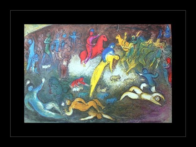 CHAGALL 1977 "DAPHNIS AND CHLOE" LITHOGRAPH - "THE CAPTURE OF CHLOE" BY MARC CHAGALL FROM THE "DAPHNIS AND CHLOE" COLLECTION - PUBLISHED IN 1977 BY GEORGE BRAZILLER (BOOK PLATE) - APPROX. IMAGE SIZE: 18.5 X 12.75 IN AND PROFESSIONALLY FRAMED GALLERY STYLE WITH BLACK ACID FREE MATT AND BLACK SOLID WOOD FRAME