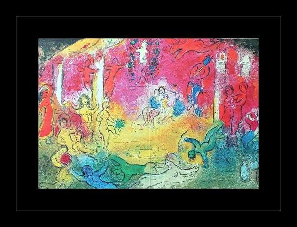 CHAGALL 1977 "DAPHNIS AND CHLOE" LITHOGRAPH - "THE TEMPLE OF BACCHUS AND HIS STORY" BY MARC CHAGALL FROM THE "DAPHNIS AND CHLOE" COLLECTION - PUBLISHED IN 1977 BY GEORGE BRAZILLER (BOOK PLATE) - APPROX. IMAGE SIZE: 18.5 X 12.75 IN AND PROFESSIONALLY FRAMED GALLERY STYLE WITH BLACK ACID FREE MATT AND BLACK SOLID WOOD FRAME