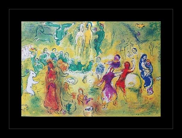 CHAGALL 1977 "DAPHNIS AND CHLOE" LITHOGRAPH - "THE WEDDING FEAST IN THE CAVE OF THE NYMPHS" BY MARC CHAGALL FROM THE "DAPHNIS AND CHLOE" COLLECTION - PUBLISHED IN 1977 BY GEORGE BRAZILLER (BOOK PLATE) - APPROX. IMAGE SIZE: 18.5 X 12.75 IN AND PROFESSIONALLY FRAMED GALLERY STYLE WITH BLACK ACID FREE MATT AND BLACK SOLID WOOD FRAME