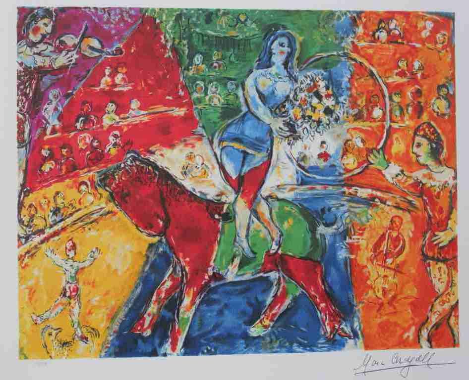 MARC CHAGALL "CIRCUS RIDER" - LIMITED EDITION LITHOGRAPH ON WOVEN PAPER -31.5" X 32.5" (FRAME) - MINT - PROFESSIONALLY FRAMED & MATTED - NUMBERED IN PENCIL 15/375 - MINT - SIGNED IN THE PLATE