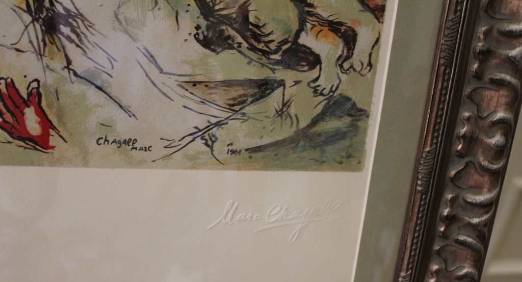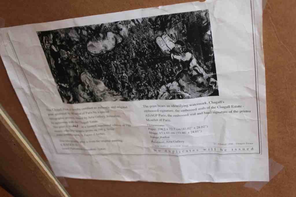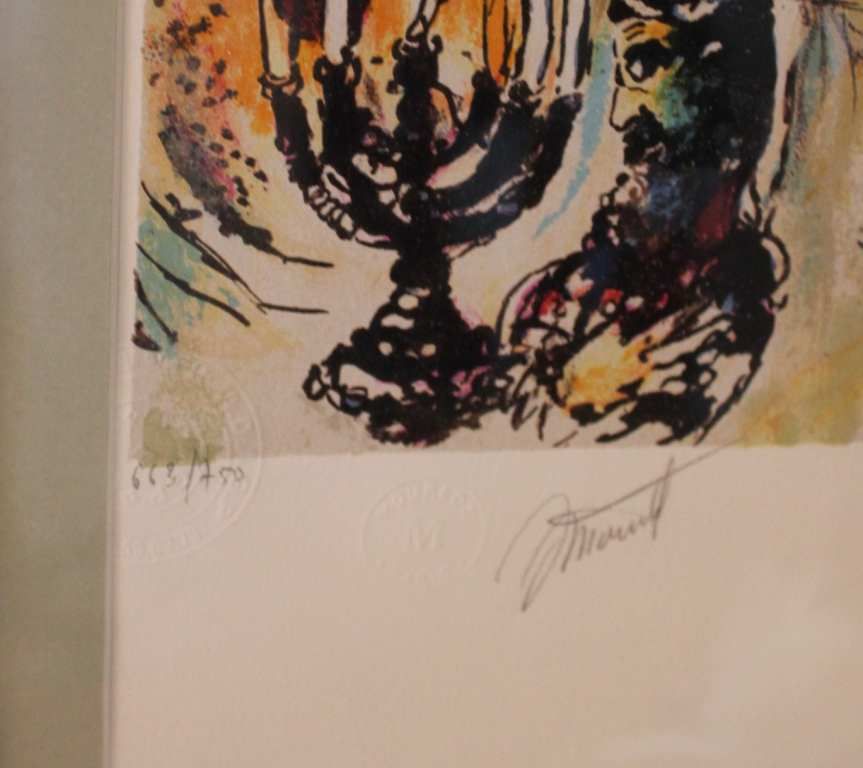 CHAGALL - "EXODUS" - ORIGINAL LITHOGRAPH - PRODUCED BY MOURLOT OF PARIS LIMITED EDITION OF 750 - NUMBER 663/750 - 1964 - IDENTIFYING WATERMARK - CHAGALL'S EMBOSSED SIGNATURE - EMBOSSED SEAL OF THE CHAGALL ESTATE - HAND SIGNATURE OF THE PRINTER - COMES WITH ARTA GALLERY PAPERWORK - IMAGE SIZE 37" X 24" (85 X 61 CM) - FRAMED 44.5" X 31.5"