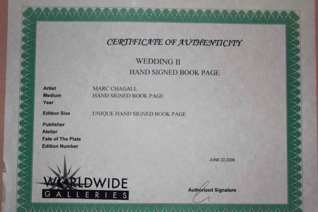 MARC CHAGALL - "WEDDING II" - HAND SIGNED BY THE ARTIST - BOOK PLATE - PROFESSIONALLY FRAMED AND MATTED - MINT CONDITION - IMAGE SIZE 11" X 9.5" - FRAMED SIZE 24.75" X 23.75" - COMES WITH CERTIFICATE OF AUTHENTICITY