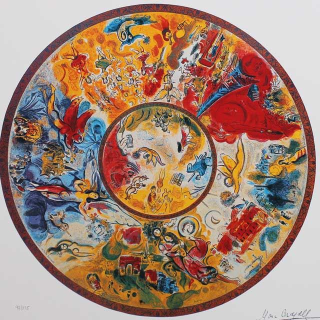 CHAGALL ** PARIS OPERA CEILING **. Artist: Marc Chagall - Title: Paris Opera Ceiling - Medium: Fine Art Giclee on Paper - Limited Edition: 375 - Image Size: Approximately 15 inch diameter - Paper Size: Approximately 17 inches x 17 inches - Signature: Facsimile Signed - Framed: Unframed - Details: This work comes with a Certificate of Authenticity - Biography: One of the greatest names in the history of art is Marc Chagall. Born in old Czarist Russia in 1887, he lived to the ripe old age of 98. His passing came in his adopted home in Paris. Chagall's story begins with the Primitivist Movement of the turn of the century. He moved to Paris in 1910, where he studied the masters Cezanne, Van Gogh and Paul Gauguin. Drawn to the excitement of the Russian Revolution, he returned to Russia in 1914 and founded the Constructionist School in 1917. After two years of intense controversy and artistic conflict, Chagall returned to a dreamy fairy tale art form that is the modern forerunner of Traditional Surrealism. His grandest showing is at the Hermitage in St. Petersburg, Russia, the largest art museum on earth. He is displayed at the most important museums without exception. His original oils bring millions of dollars art auction. His signed and numbered graphics command tens of thousands. - Warranty: Item GUARANTEED to be as described