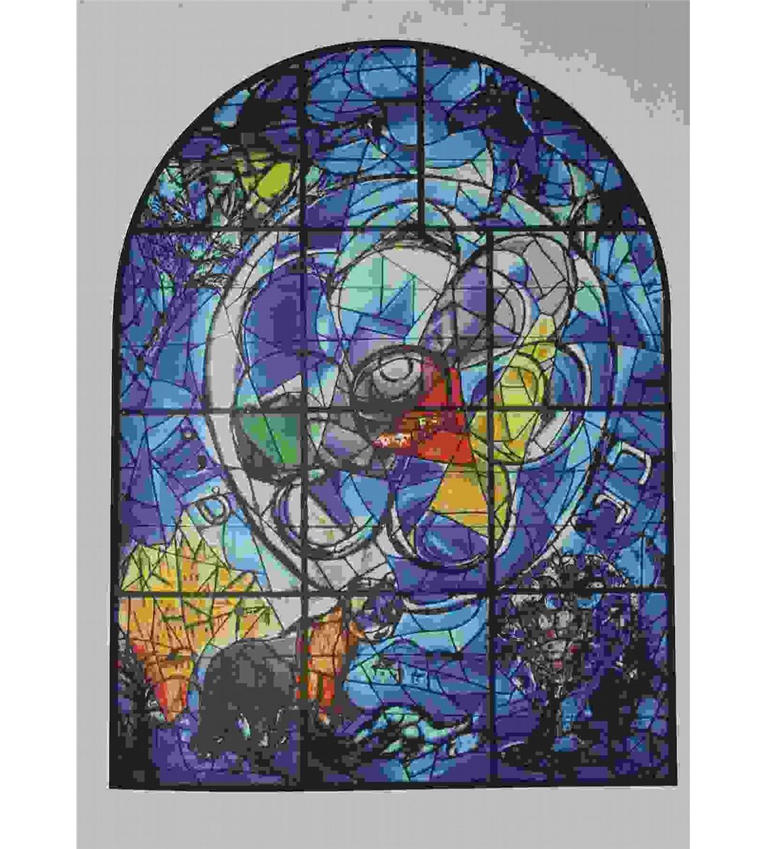 MARC CHAGALL "THE TRIBE OF BENJAMIN" - PRINTED IN GERMANY BY HERDER IN 1964 ON WOVE PAPER - VINTAGE GERMAN EDITION GRAVURE OF THE FAMOUS JERUSALEM WINDOW CREATED IN 1962 FOR THE SYNAGOGUE AT THE HADASSAH-HEBREW UNIVERSITY MEDICAL CENTER IN THE JUDAEAN HILLS - 12 WINDOWS WERE CREATED, ONE FOR EACH OF THE 12 TRIBES OF ISRAEL - IMAGE SIZE APPX. 8" X 6" - PROFESSIONALLY FRAMED AND MATTED