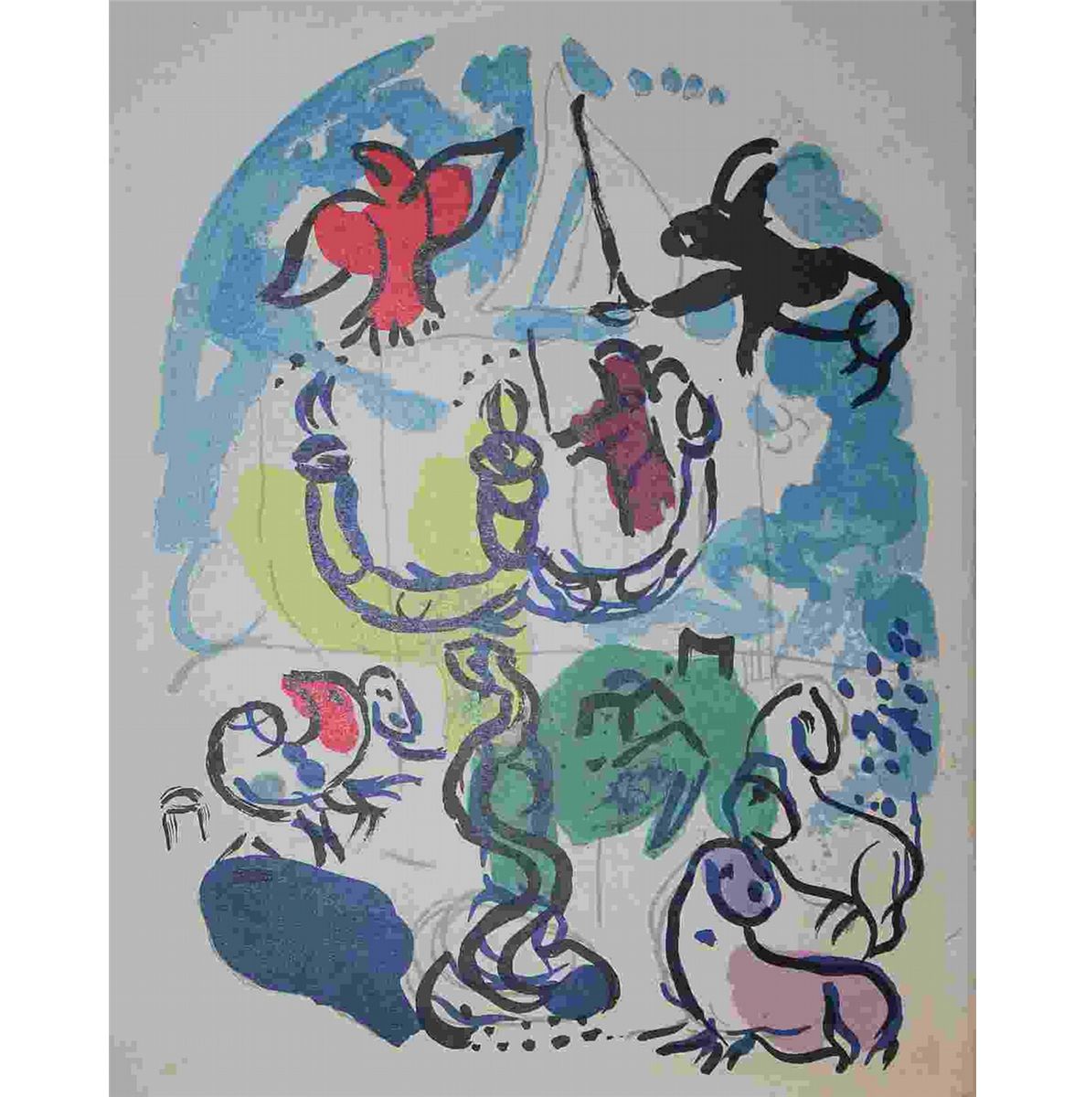 MARC CHAGALL "THE TRIBE OF DAN" LITHOGRAPH - PRINTED IN PARIS BY ANDRE SAURET IN 1963 ON WOVE PAPER FOR THE COVER OF THE FIRST EDITION OF "CHAGALL WINDOWS FOR JERUSALEM" - FIRST EDITION LITHOGRAPH OF THE FAMOUS JERUSALEM WINDOW CREATED IN 1962 FOR THE SYNAGOGUE AT THE HADASSAH-HEBREW UNIVERSITY MEDICAL CENTER IN THE JUDAEAN HILLS - 12 WINDOWS WERE CREATED, ONE FOR EACH OF THE 12 TRIBES OF ISRAEL - IMAGE SIZE APPX. 8" X 6" - PROFESSIONALLY FRAMED AND MATTED