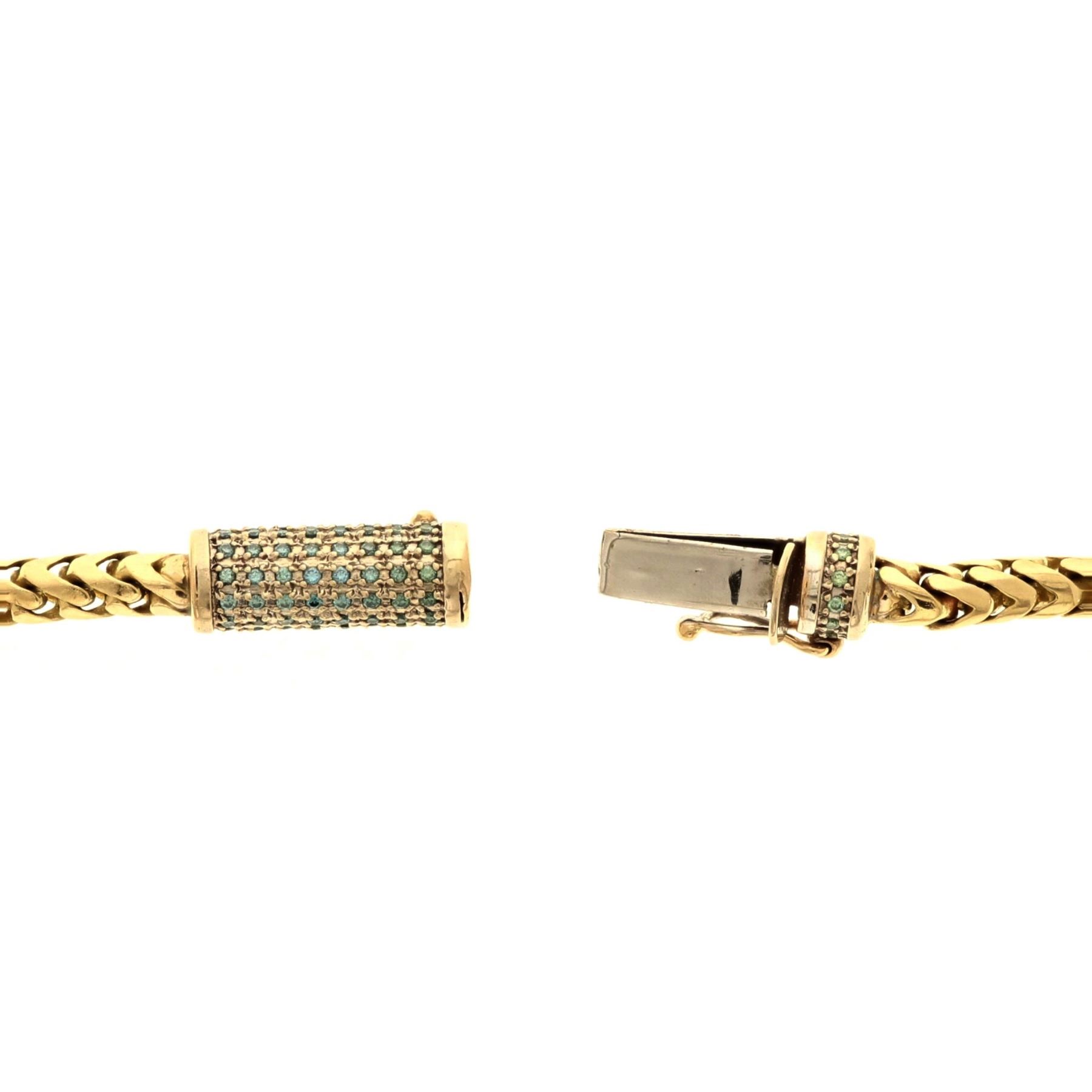 CHAIN: [1] 14kYG solid Franco square link chain, 36 inch, 4.5mm width, 100 enhanced blue diamonds, 1.00 ct. TWA, 113.6 grams.