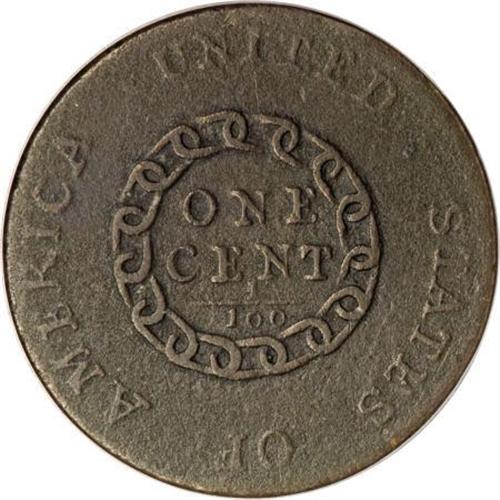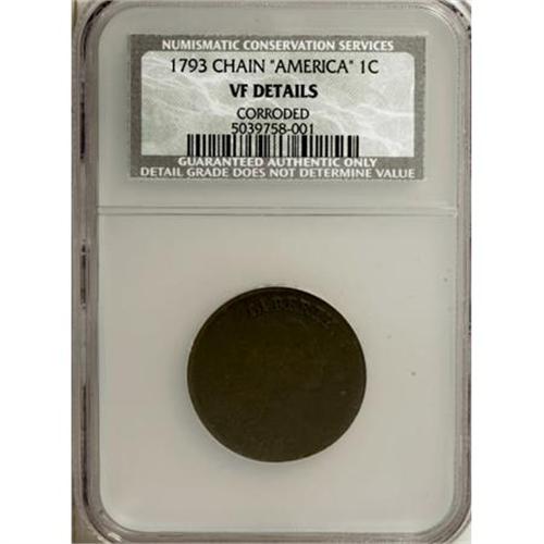 <B>1793 Chain 1C Periods--Corroded--NCS. VF Details.</B></I> S-4, B-5, R.3. With Periods. Moderately corroded surfaces on both sides, yet with considerable underlying detail. While Liberty is a little weak, the date and lettering on both sides are full and complete. Even the branching die cracks at the lower left obverse are fully visible. EAC 5.<BR><BR><B>Coin Engraver:</B> Henry Voigt<BR><BR><b>Shipping:</b> Coins & Currency (<a target="_blank" href="http://www.heritageauctions.com/common/shipping.php">view shipping information</a>)